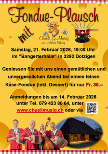 21. Februar 2026, 19:00 Uhr, im "Bangerterhaus" (Rigigässli 9) in 3293 Dotzigen BE. Geniessen Sie mit uns ein währschaftes Käsefondue. Reservieren Sie diesen Termin bereits