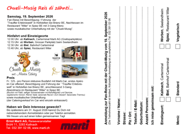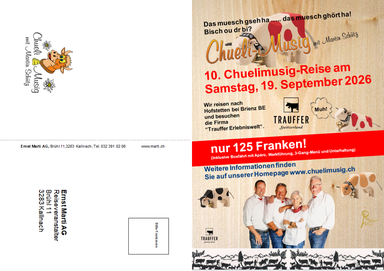 Nach der letzten, wiederum sehr erfolgreichen Chuelimusig-Reise möchten wir auch im 2026 wiederum mit unseren treuen Fan's einen unvergesslichen Tag geniessen. Wir sind überzeugt, zusammen mit